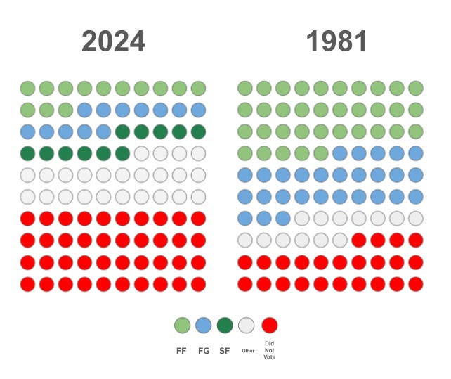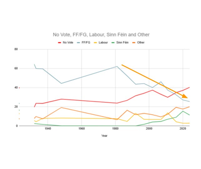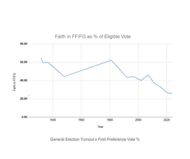 In 1981, FF and FG shared 81.6% of the vote on a 76.5% turnout – only in 1932 did they fair better. This 63% satisfaction with FF / FG has been in terminal decline ever since and today, the two main parties share 43% of the vote – which in reality only represents 25.5% of the electorate given that 40% don’t vote. Their combined number of voters is significantly behind the non-voter cohort.
