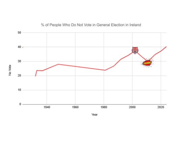 40.3% of eligible voters did not vote in the 2024 Irish General Election. This is the lowest turnout since 1923. With the exception of 2011, when people were clearly irate after the economic crash, the voter turnout has steadily declined for decades. It seems that the election simply doesn’t matter to a growing cohort of Irish voters.
